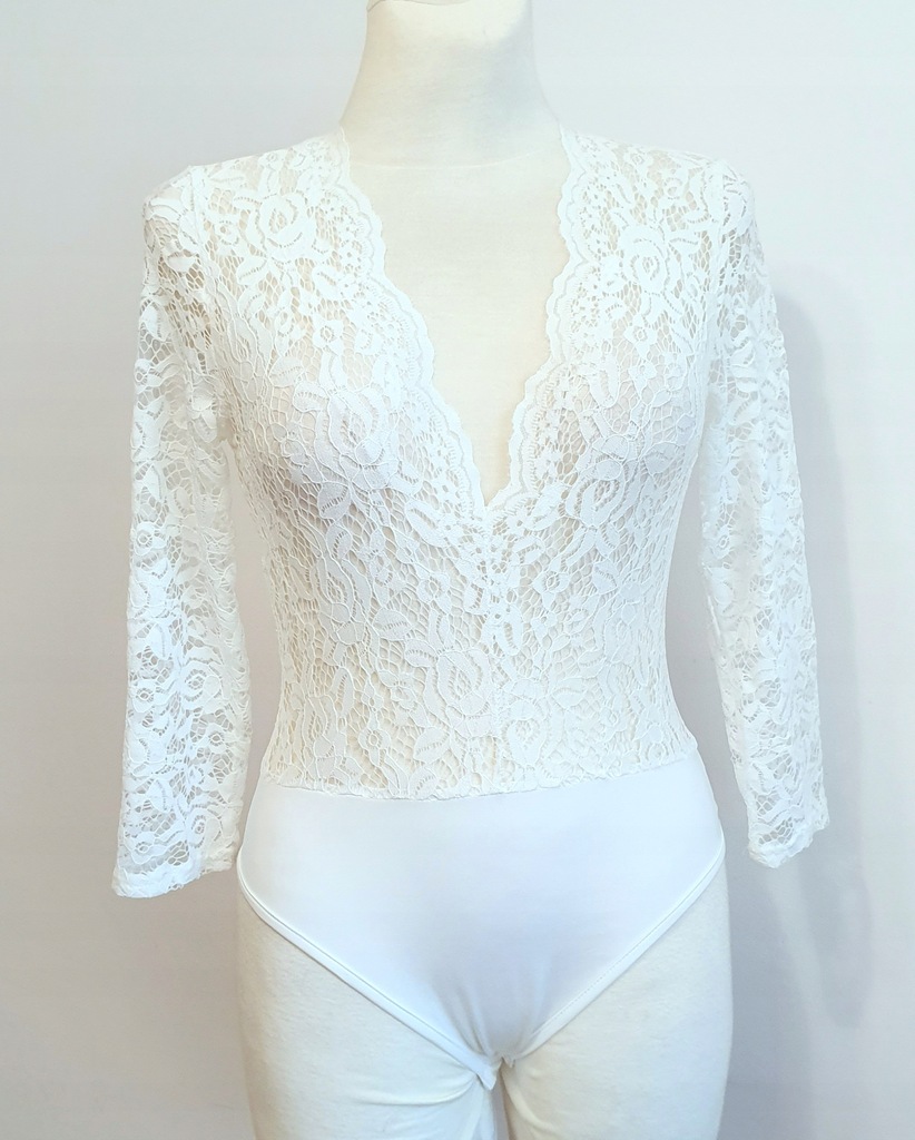 Białe Koronkowe Body Z Długim Rękawem